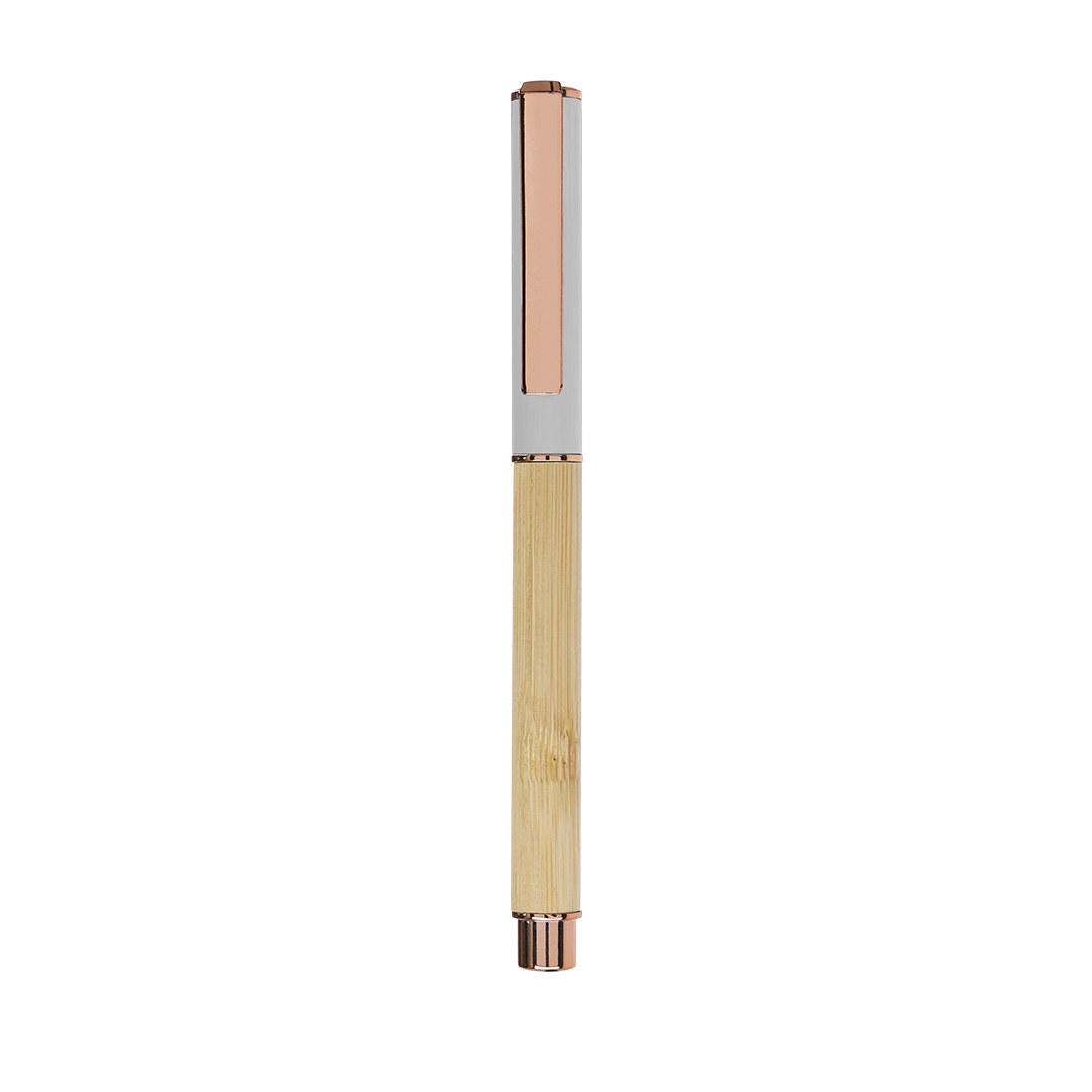 Elegante roller fabricado en bambú y aluminio. Con clip metálico, empuñadora y detalles de acabado oro rosa, caña fabricada en bambú y tapadera en aluminio. Con cartucho jumbo, en tinta azul y con cierre de capucha.